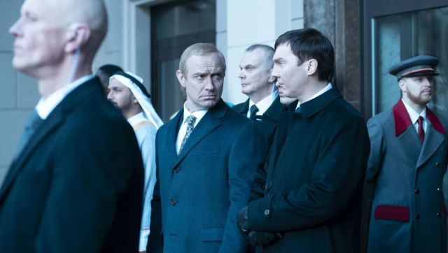 Cette approche soulève plusieurs difficultés. Premièrement, un sentiment de gêne : le film est entièrement dépourvu de contrechamp. Personne ne contredit Baranov (les interventions du chercheur servant surtout à relancer le récit), ni ne propose une autre vision de la politique et de l’histoire que celle donnée par le pouvoir russe, le film observant Poutine avec une certaine fascination, et semblant même lui trouver, par moment, des circonstances atténuantes. Ce qui pouvait fonctionner dans un livre, où le contrechamp est en réalité le lecteur lui-même, fort de ses répliques intérieures et de sa maitrise du temps, ne peut opérer de la même manière au cinéma où le pouvoir de l’image est bien trop grand et où le temps est contrôlé par le metteur en scène. Le dernier plan ne change rien à l’affaire. Deuxièmement, une impression de survol glacé, qui n’est pas étrangère à cette absence de contrechamp : tout va bien trop vite, et la masse narrative est à la fois trop importante et trop condensée, pour que les faits rapportés s’incarnent en une dramaturgie cinématographique propre à susciter l’adhésion (malgré l’histoire d’amour avec Ksénia, trop intermittente). Troisièmement, et en dernier lieu, un sentiment d’ennui : on finit par se désintéresser d’une histoire que l’on connait déjà, qui semble hésiter formellement entre le documentaire et le récit édifiant, et dont nous ne percevons que la surface à peine ébréchée. Enfin, se trouve accentué un défaut du livre, à savoir une certaine difficulté à nous faire comprendre les motivations de Baranov, en raison de l’interprétation tout en retenue et peu crédible de Paul Dano, qui ne permet pas de cerner son personnage. L’interprétation de surface de Jude Law ne permet pas davantage d’en savoir plus sur Poutine.