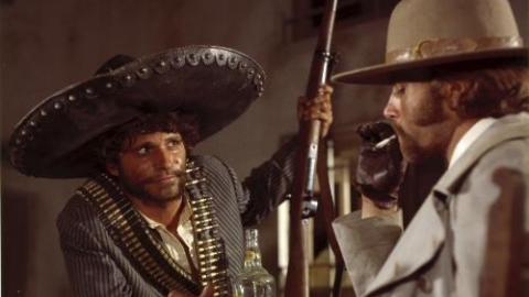La révolution mexicaine, et sa guérilla couvrant une décennie de 1910 à 1920, a offert un cadre de prédilection à maints westerns spaghetti, et en particulier à Il Etait une fois la révolution (1971) de Leone, encore lui, dont les deux personnages principaux sont également un paysan révolutionnaire et un artificier européen. Mais les similitudes entre les deux films s’arrêtent là. Le film de Leone raconte avec un ton d’une mélancolie progressive le crépuscule des illusions révolutionnaires, qui exigent toujours le sacrifice des individus ou de leur conscience. Celui de Corbucci, plus enlevé, imagine avec un esprit bien plus ludique une alliance contre-nature entre Paco Roman (Tony Musante), mineur rebellé, et ce Polack flegmatique (Franco Nero), qui mesure ses fidélités aux espèces sonnantes et trébuchantes qui lui sont versées. Soit un idéaliste candide dont le programme révolutionnaire consiste à voler les riches sans voir plus loin, et un pistolero vénal et cynique. Le duo devient bientôt trio puisque les deux hommes sont poursuivis par Curly (Jack Palance), tenancier de casino qui a mis sa silhouette efflanquée et son visage émacié au service de l’armée fédérale. Puis quatuor, car la belle Colomba (Giovanna Ralli), une passionaria mexicaine, se joint bientôt à Paco et au mercenaire dans l’espoir de stimuler les aspirations révolutionnaires du premier. Un cinquième homme, invisible à l’image, rythme leurs escarmouches : Ennio Morricone, qui apporte au récit une de ces partitions à la mélodie sifflée dont il possède le secret.