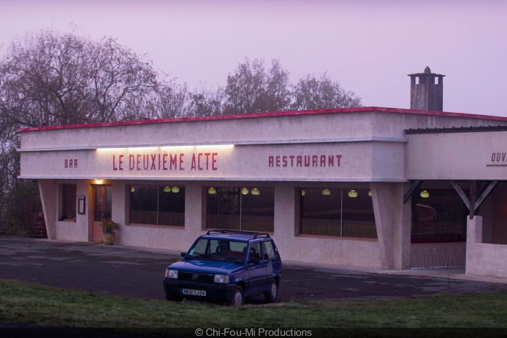 Comme dans Yannick, se mêle à la satire un malaise progressif. Il nait d’abord des lieux du film : une route de campagne solitaire et entourée de forêt qui aboutit au milieu de nulle part, où a surgi de terre un bar restaurant. Ensuite, de la manière dont Dupieux brise le quatrième mur : les acteurs se savent filmés et s’adressent parfois à une équipe invisible puisque le film se présente comme une première prise de vue sans montage, mêlant le champ et le hors champ, le film dans le film et le journal de son tournage, sans que l’on sache au début ce qui appartient à l’un ou à l’autre. Puis, de l’écart existant entre l’égotisme des comédiens, entièrement préoccupés d’eux-mêmes, et la crise de panique du figurant devant verser du vin dans leur verre : saisi d’un tremblement compulsif, les yeux rougis par la honte et les pleurs, il n’y parvient pas. Ce qui devrait être pour lui un moment de joie (il voit en vrai ses idoles), devient la plus grande humiliation de sa vie, les acteurs finissant par se moquer de lui. Enfin, de l’idée suivante : si les comédiens mélangent ainsi dialogues du film dans le film et digressions les faisant sortir de leur rôle sans que le réalisateur ne les interrompe, c’est parce que ce dernier est une intelligence artificielle absente du tournage. Non seulement rien de ce que nous voyons n’existe réellement – sauf pour le figurant qui prend tout cela au sérieux – mais en plus cela n’a pas été inventé par l’homme qui en est devenu le jouet.